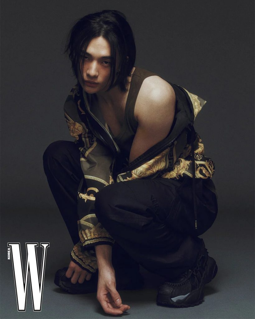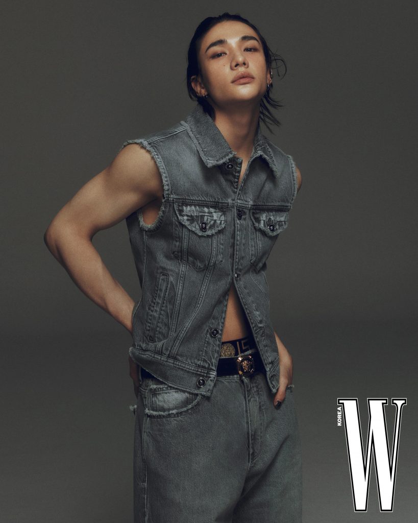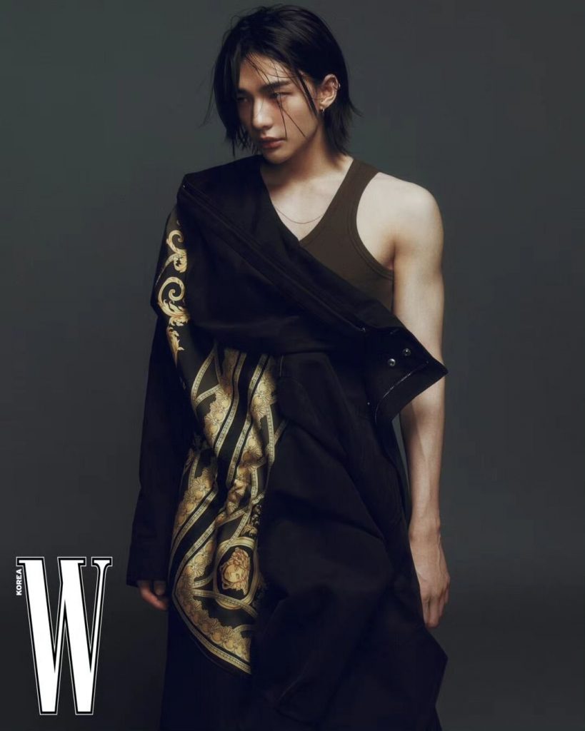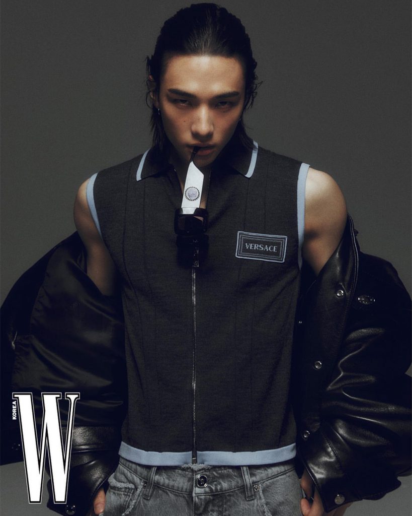In 2024, he wore Versace for Milan Fashion Week, Stray Kids’ global tour, and custom fittings designed by Donatella herself. The looks were dramatic, athletic, and made for performance. He debuted the first on stage in Seoul: a crystal-net balaclava, sleeveless logo tank, and structured cargo pants. That same summer, he appeared in W Korea, continuing the editorial momentum.