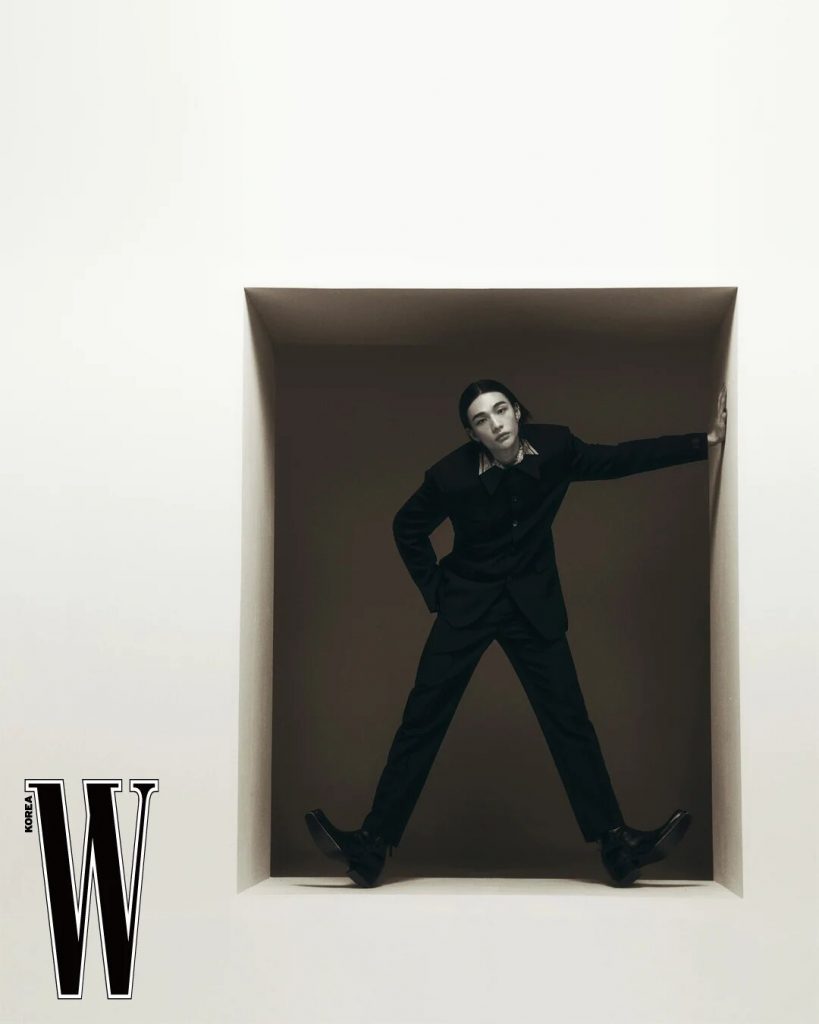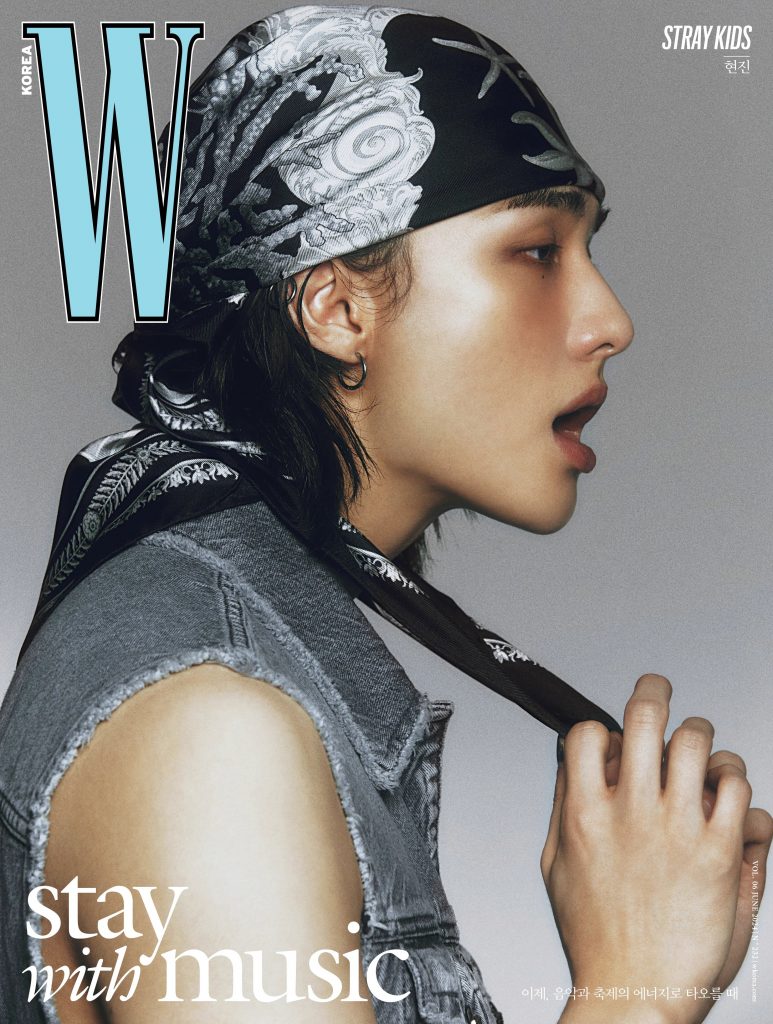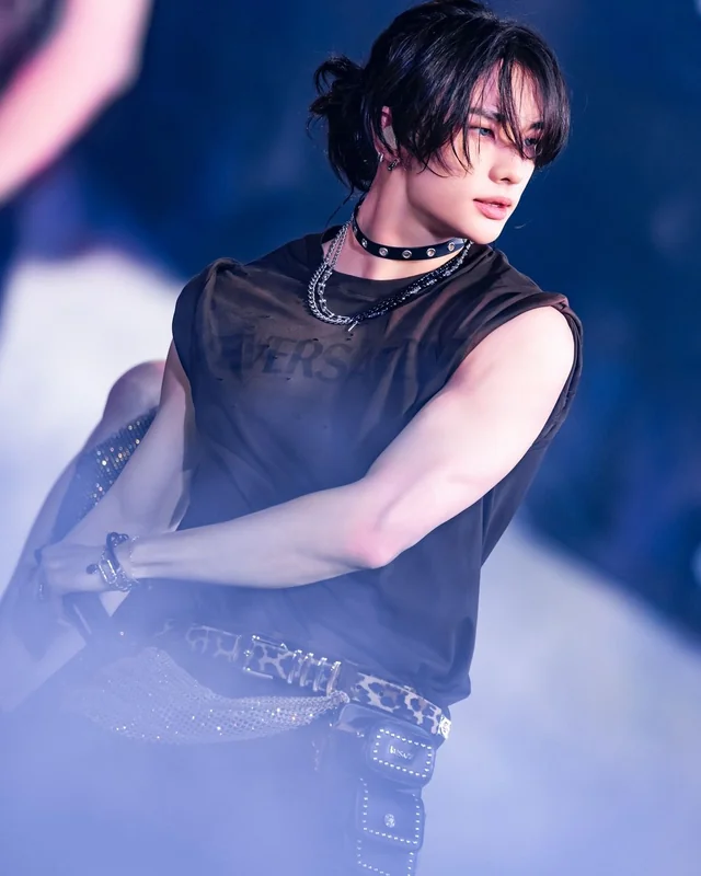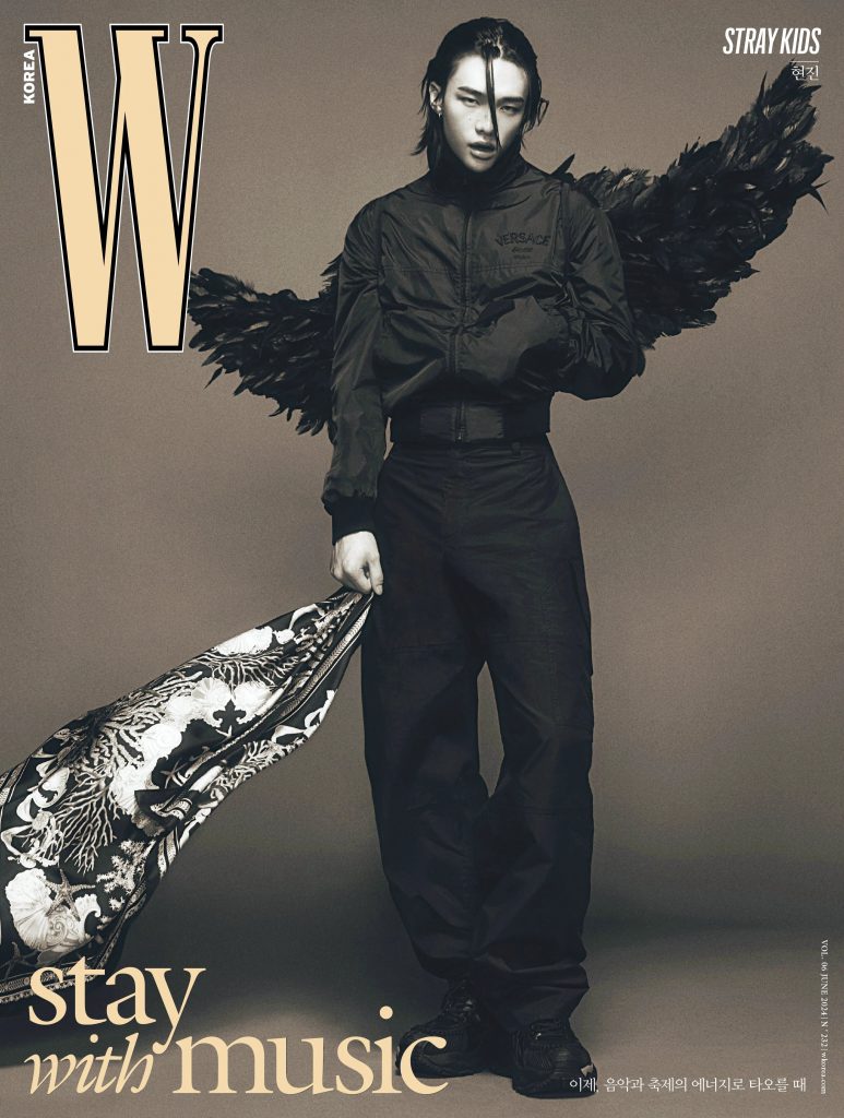 In 2024, he wore Versace for Milan Fashion Week, Stray Kids’ global tour, and custom fittings designed by Donatella herself. The looks were dramatic, athletic, and made for performance. He debuted the first on stage in Seoul: a crystal-net balaclava, sleeveless logo tank, and structured cargo pants. That same summer, he appeared in W Korea, continuing the editorial momentum.