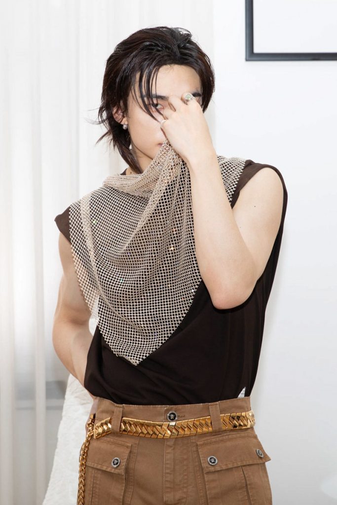 Hyunjin understands Versace. He knows how to wear the most extravagant pieces without losing himself under them. The shaved buzzcut with the Versace logo on top, the soft tailoring, the sleeveless tanks styled for movement. Everything it’s aligned with how he moves, how he performs, how he lives. Every single interaction stated the obvious: Versace understands him back. They design for his body in motion.